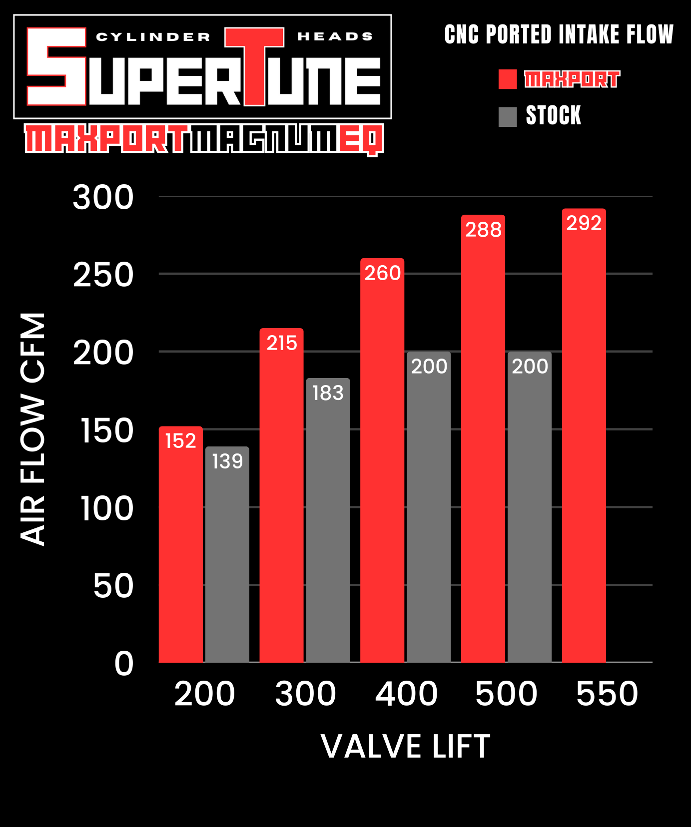 Our SuperTune MAXPORT MAGNUM Heads are the best flowing EQ-Style Small Block MOPAR heads available. They'll suck in 292 CFM of atmosphere at .550 lift, and also move 215 CFM & 260 CFM through the ports at just .300 & .400 lift, respectively. These mid-range lift numbers are the ones that do most of the work as your engine revs throughout its operating range, helping provide incredible overall performance and flexibility. The airflow characteristics and dynamics of these heads can support more than 500 bhp up top, and also give you a nice, fat, meaty power-punch in the mid ranges. Great for the strip
